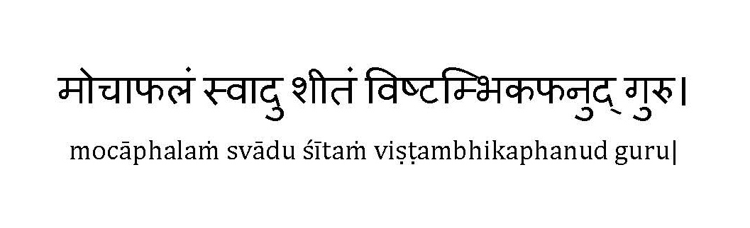 As previously discussed in my blog (and newsletter dated October 17, #42 Volume 3), the small and aromatic bananas are great to consume, because they do not carry channel-blocking property. However, in general, small aromatic bananas, particularly in the United States, are very rarely available. Larger bananas are readily found across the world and that is what people tend to consume. As far as the reference is concerned, here is a verse from Bhav Mishra’s Bhav Prakash Nighantu, – which is considered to be the best “nighantu,” the best commentary for Ayurveda’s materia medica:VFB-img1